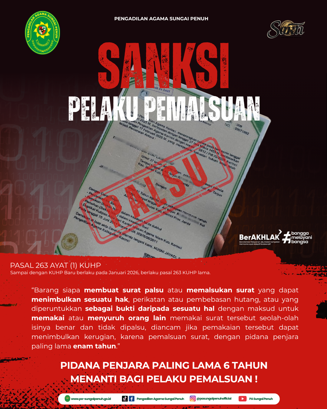 Pengadilan Agama Sungai Penuh mengimbau masyarakat untuk berhati-hati dan selalu memastikan keaslian akta cerai melalui layanan resmi. Apabila ditemukan dokumen mencurigakan, masyarakat diminta segera melapor ke pihak pengadilan atau kepolisian terdekat.