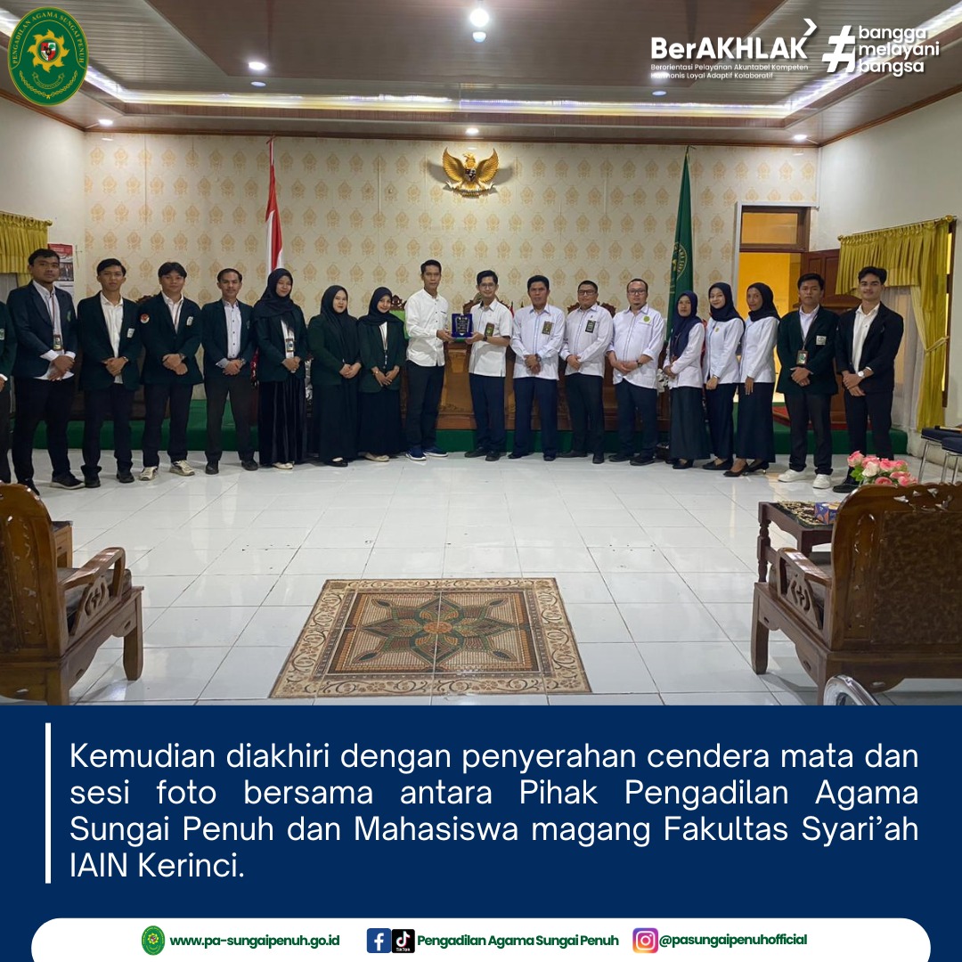 13 Oktober 2025, Pengadilan Agama Sungai Penuh mengucapkan terima kasih dan apresiasi yang setinggi-tingginya kepada adik-adik mahasiswa dari IAIN Kerinci yang telah melaksanakan kegiatan magang di lingkungan kantor kami.