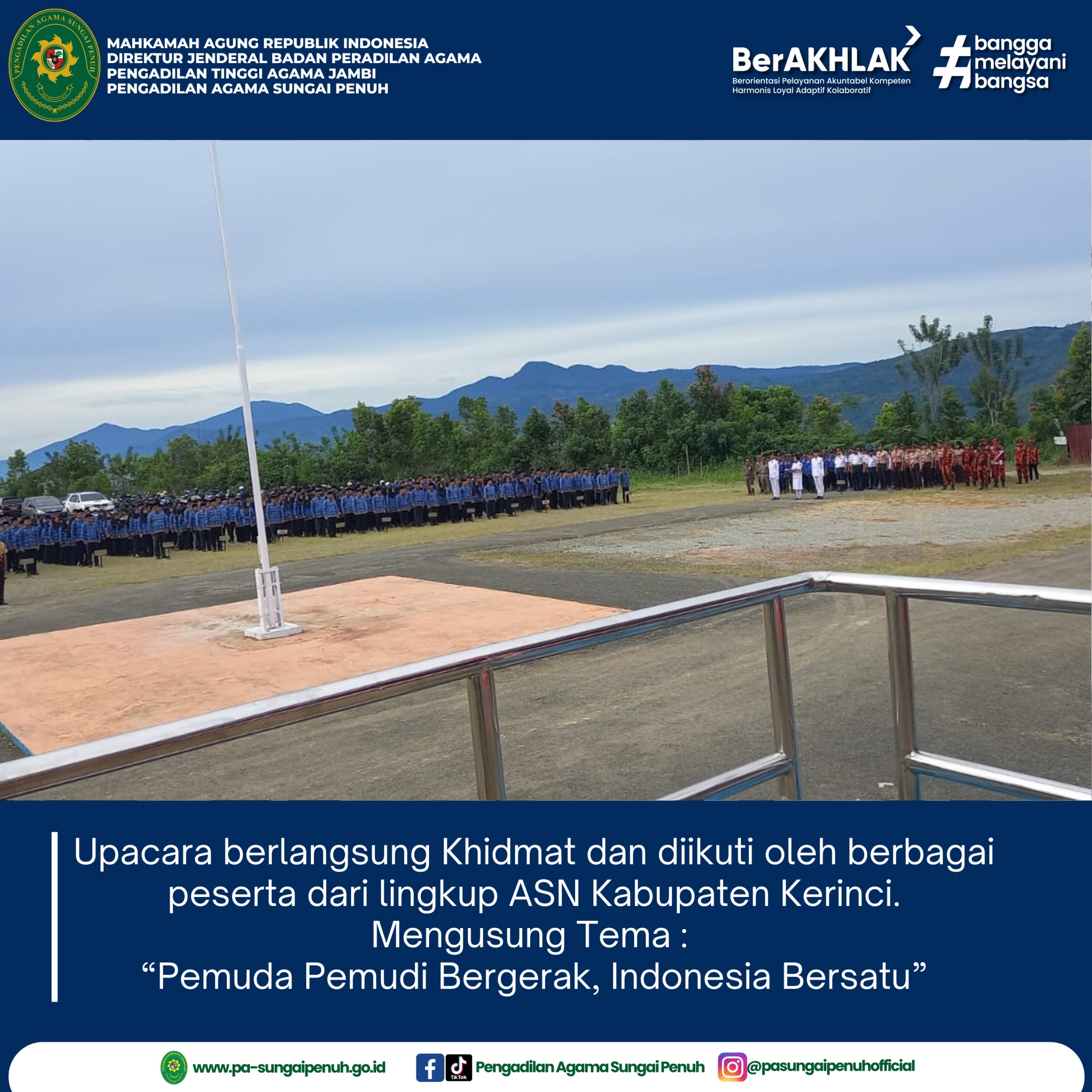Dalam rangka memperingati Hari Sumpah Pemuda ke-97 Tahun 2025, Ketua Pengadilan Agama Sungai Penuh, Mohammad Ilhamuna, S.H.I., M.H., menghadiri Upacara Peringatan Hari Sumpah Pemuda yang diselenggarakan di Lapangan Kantor Bupati Kerinci.