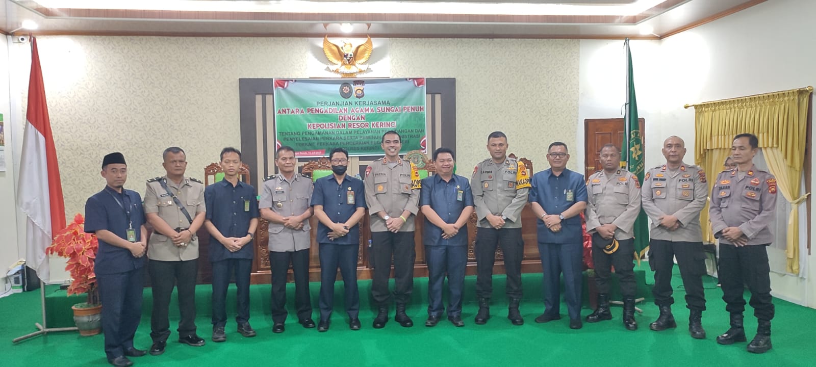 Sungai Penuh, 13 Juli 2023 - Perpaduan yang harmonis antara kekuatan hukum dan keamanan menjadi sorotan utama pada acara penandatangan perjanjian kerja sama yang berlangsung di Aula Cakra I Pengadilan Agama Sungai Penuh pada Kamis (13/7). Dalam perjanjian kerja sama yang ditandatangani, Polres Kerinci dan Pengadilan Agama Sungai Penuh saling berkomitmen untuk meningkatkan pengamanan dalam pelayanan persidangan dan memenuhi administrasi perceraian pegawai negeri di wilayah kerja Polres Kerinci.