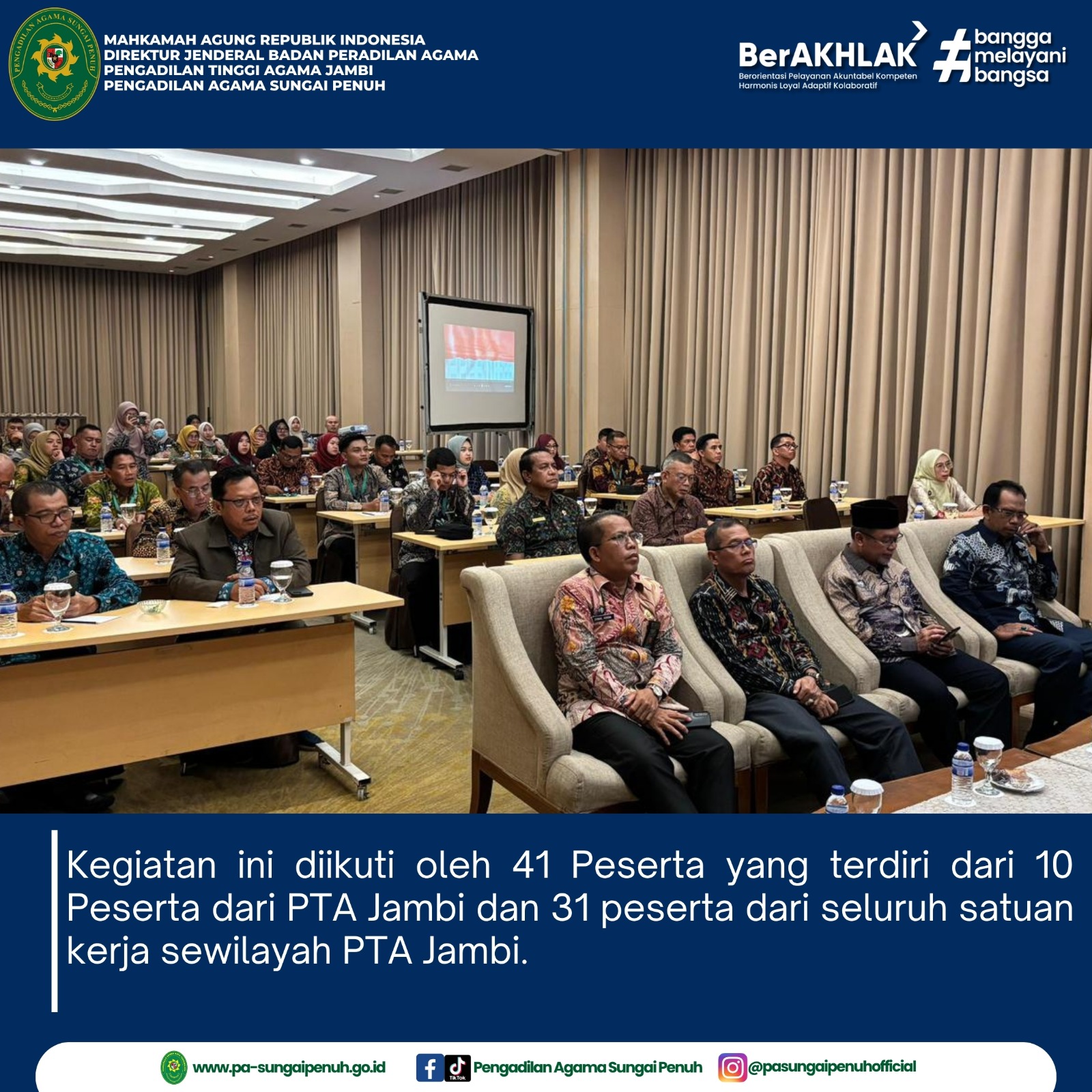 Kegiatan ini dibuka oleh YM Ketua Pengadilan Tinggi Agama Jambi dan dihadiri oleh Wakil Ketua, Hakim Tinggi, Panitera, Plt. Sekretaris serta pejabat Struktural Pengadilan Tinggi Agama Jambi. Dilanjutkan dengan penyampaian materi Tentang Kebijakan Umum PTA Jambi oleh YM Ketua Pengadilan Tinggi Agama Jambi, Bapak Dr. H. Chazim Maksalina, M.H. dan diikuti oleh 41 peserta yang terdiri dari 10 peserta dari PTA Jambi serta 31 peserta dari satuan kerja se-wilayah PTA Jambi.