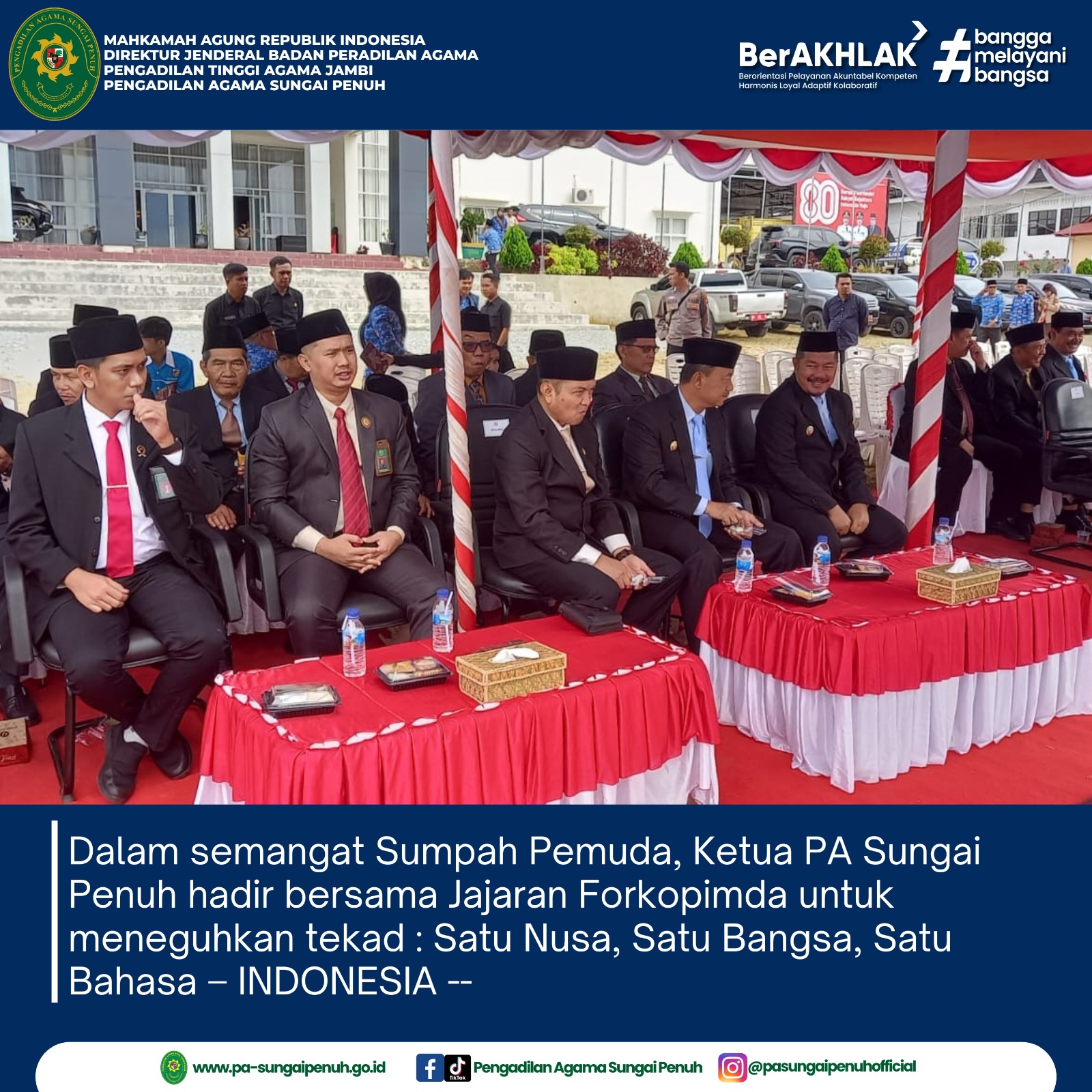 Dalam rangka memperingati Hari Sumpah Pemuda ke-97 Tahun 2025, Ketua Pengadilan Agama Sungai Penuh, Mohammad Ilhamuna, S.H.I., M.H., menghadiri Upacara Peringatan Hari Sumpah Pemuda yang diselenggarakan di Lapangan Kantor Bupati Kerinci.